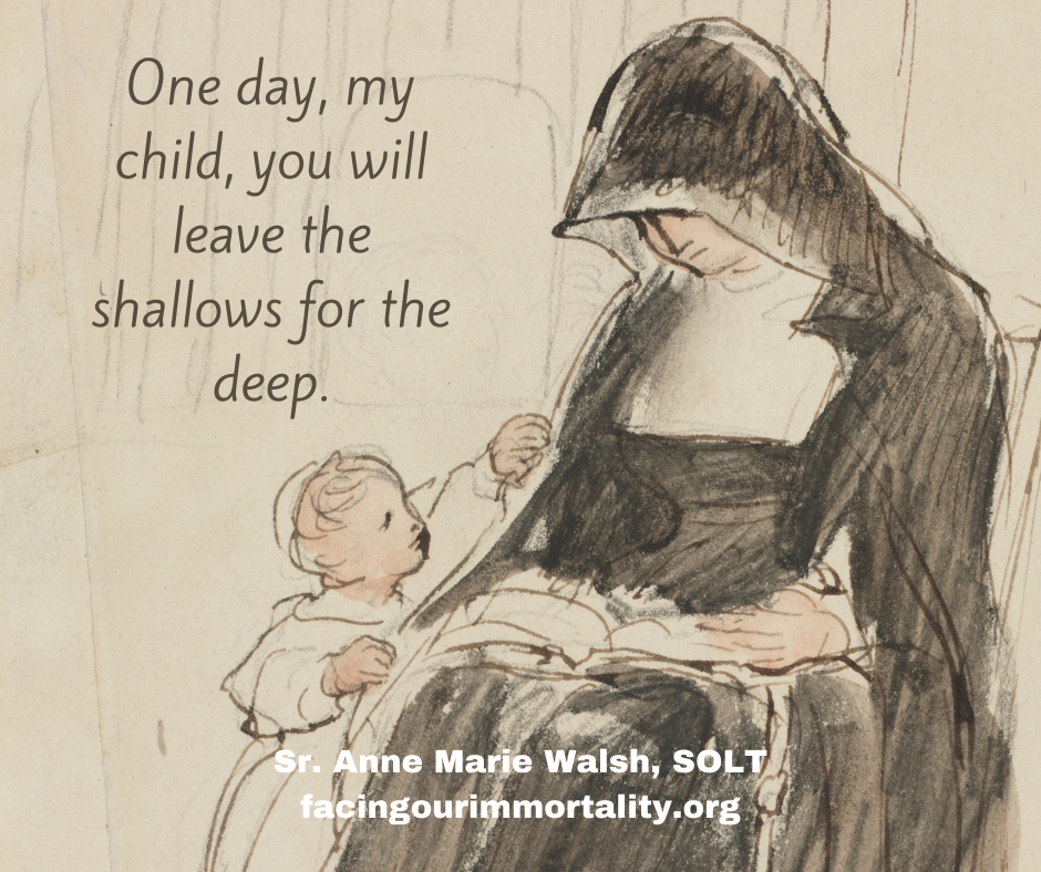 The choice to move out of the shallows of our lives and into the deep is no small thing. It is the difference between mediocrity and greatness as measured in the Lord. It demands courage and determination to persevere no matter what comes. Sr. Ann Shields says it powerfully: “I am finished with low living, sight walking, small planning, smooth knees, colorless dreams, tamed visions, mundane talking, frivolous living, selfish giving, and dwarfed goals. I lean on Christ’s presence. I love with patience, live by prayer, and labor with the power of God’s grace. My face is set. My gait is fast, my goal is heaven. My road is narrow, my way is rough, my companions are few, my Guide is reliable, and my mission is clear. I cannot be bought, compromised, detoured, lured away, turned back, deluded, or delayed. I will not flinch in the face of sacrifice, hesitate in the presence of adversity, negotiate at the table of the enemy, ponder at the pool of popularity, or meander in the maze of mediocrity. I won’t give up, shut up, let up, or slow up until I have stayed up, stored up, prayed up, paid up, and spoken up for the cause of Christ. I am a disciple of Jesus.”