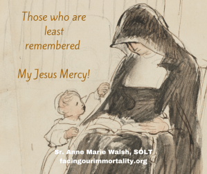 Maria Simma, a mystic who received many visits from the souls in Purgatory, said the biggest complaint of the souls who came to her asking for prayers was that their families, their relatives forgot about them and never had prayers or Masses said for them. Sometimes all they needed was one or two Masses so they could be released and finally be with God in heaven, their one overwhelming and burning desire. Maria felt it was, at the least, neglectful on our part and, at the most, cruel to forget them this way since what they suffer in Purgatory is so much greater than we can imagine, and we can so quickly obtain relief and deliverance for them. They cannot help themselves because the time for meriting is passed. But we can help them from here. And they are so grateful that in turn they do much to assist us in return by obtaining special graces for us.