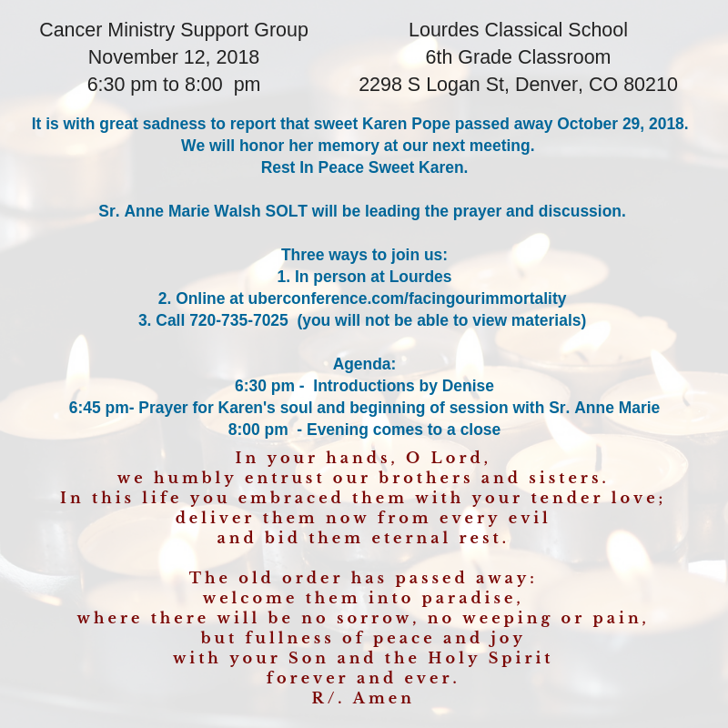 We are a spiritual ministry, based on the principles of Catholic teaching, for those who are pained and aggrieved by cancer or serious illness. We meet once per month in a safe environment, which provides a loving atmosphere formed in the community of Christ. Mutual respect for the dignity, privacy and confidentiality of each participant is fully embraced.