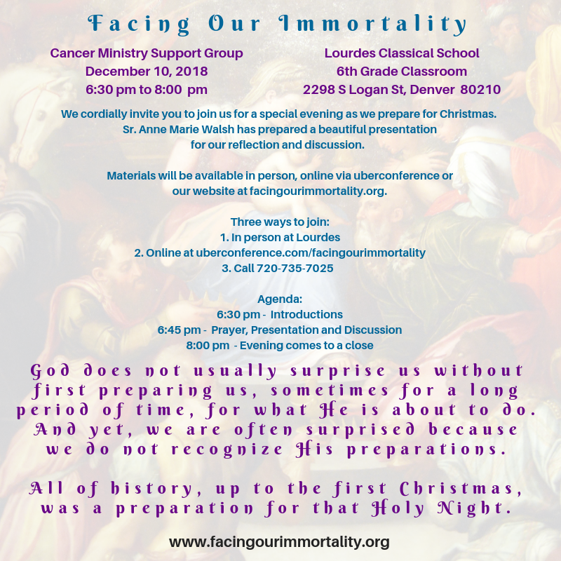 - We want to know when you are in need of special prayers. Ongoing prayer requests are sent out via email, but also published on the website. The website also has a section for resources and prayer links. We appreciate additional suggestions that you may have, and as our ministry grows, we will continue to add more information in this section. If you would like to request a prayer request, please email Denise at facingourimmortality@gmail.com. There are also comment and request forms within the website.