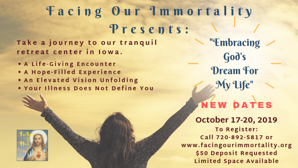 As we work together to suppress the coronavirus we at Facing Our Immortality continue to offer monthly evening retreats on Zoom with Sr. Anne Marie Walsh, SOLT. We will notify you when Domus Trinitatis (Our Retreat Center) is open for retreats and when we resume retreats in other locations. Thank you for understanding.